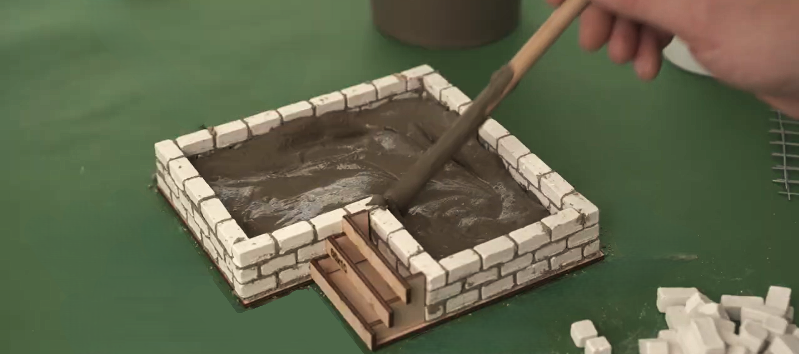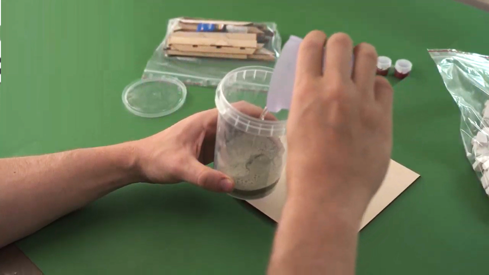 Pour 150 ml of water into a bucket with foundation mortar and stir until there is no dry mixture left. Use a metal spoon or fork (don't worry, it will wash off easily).